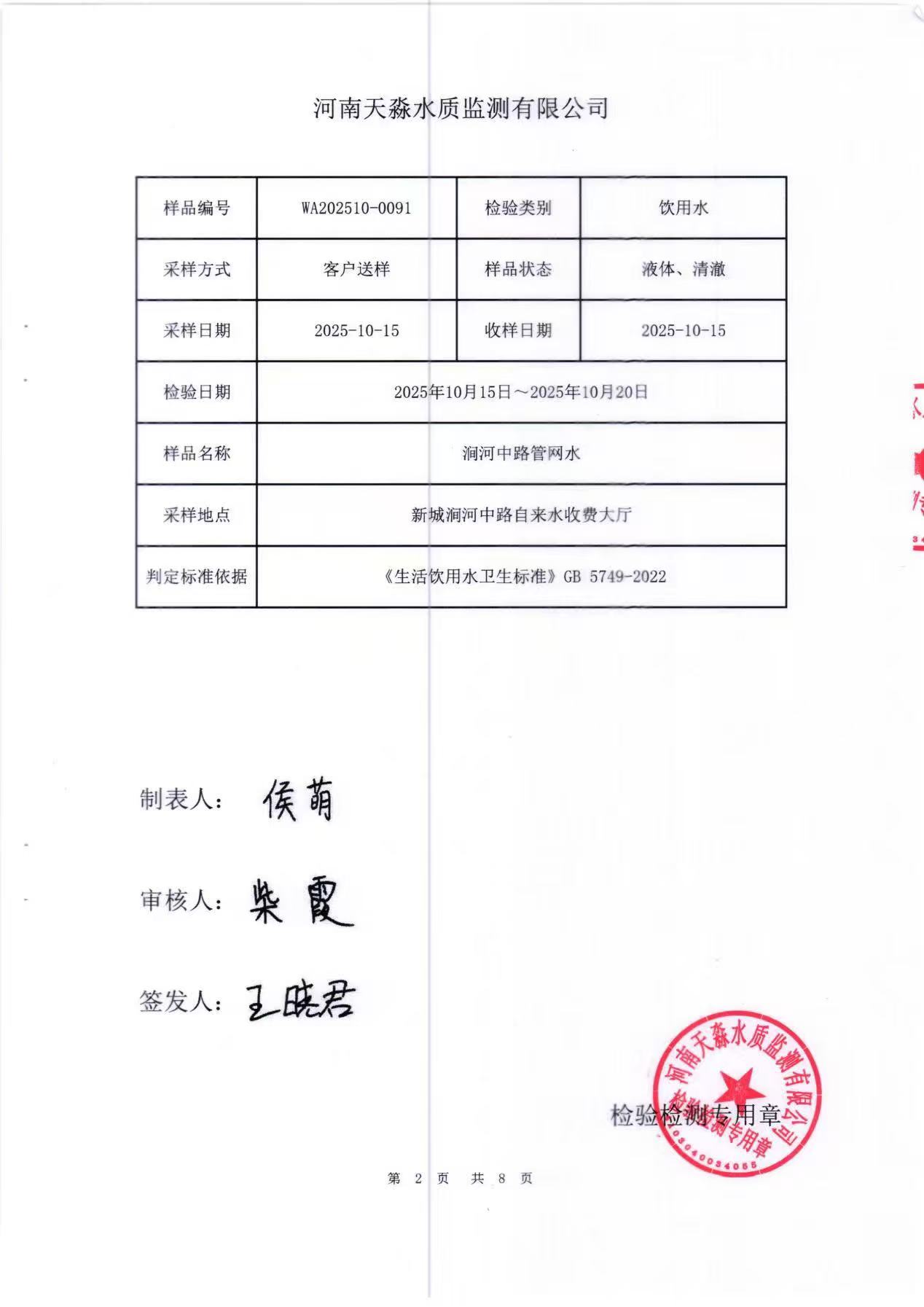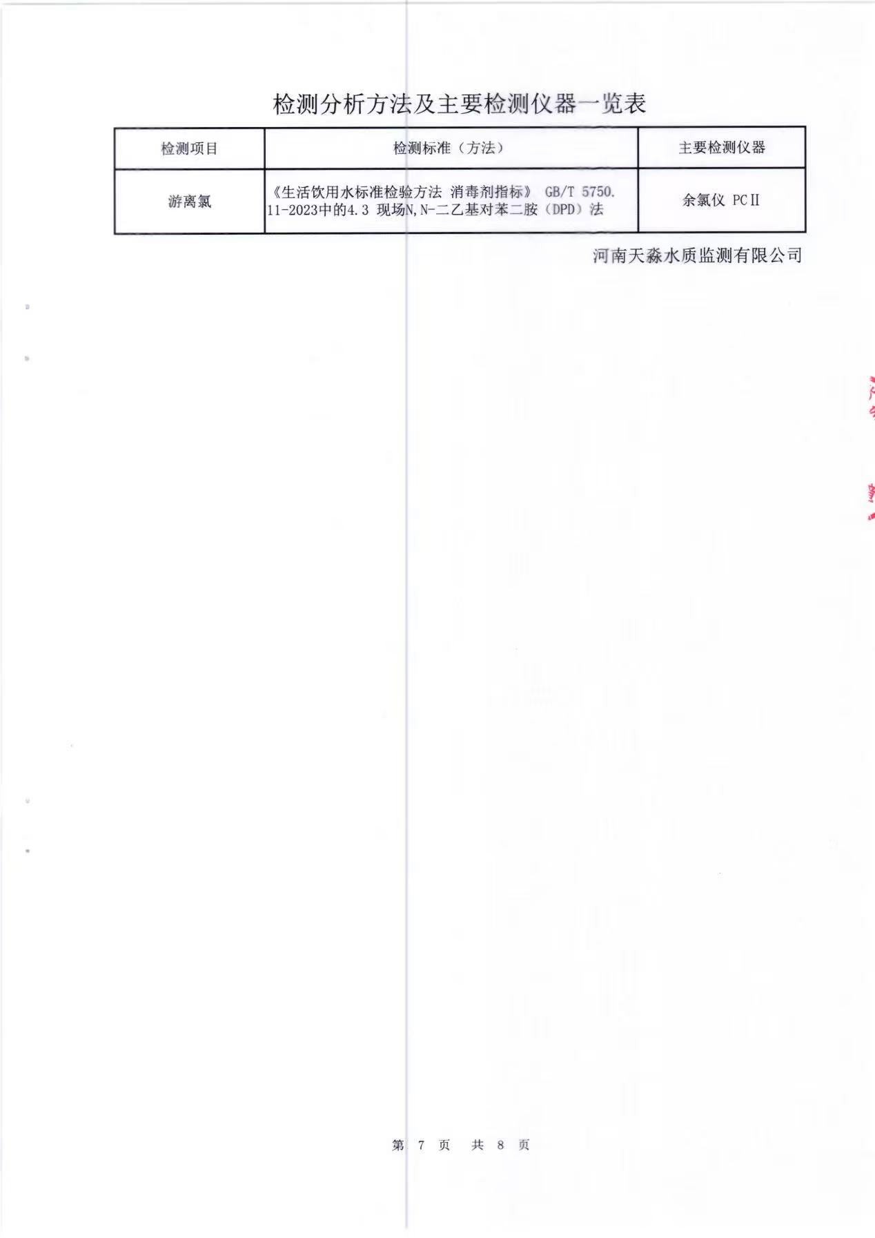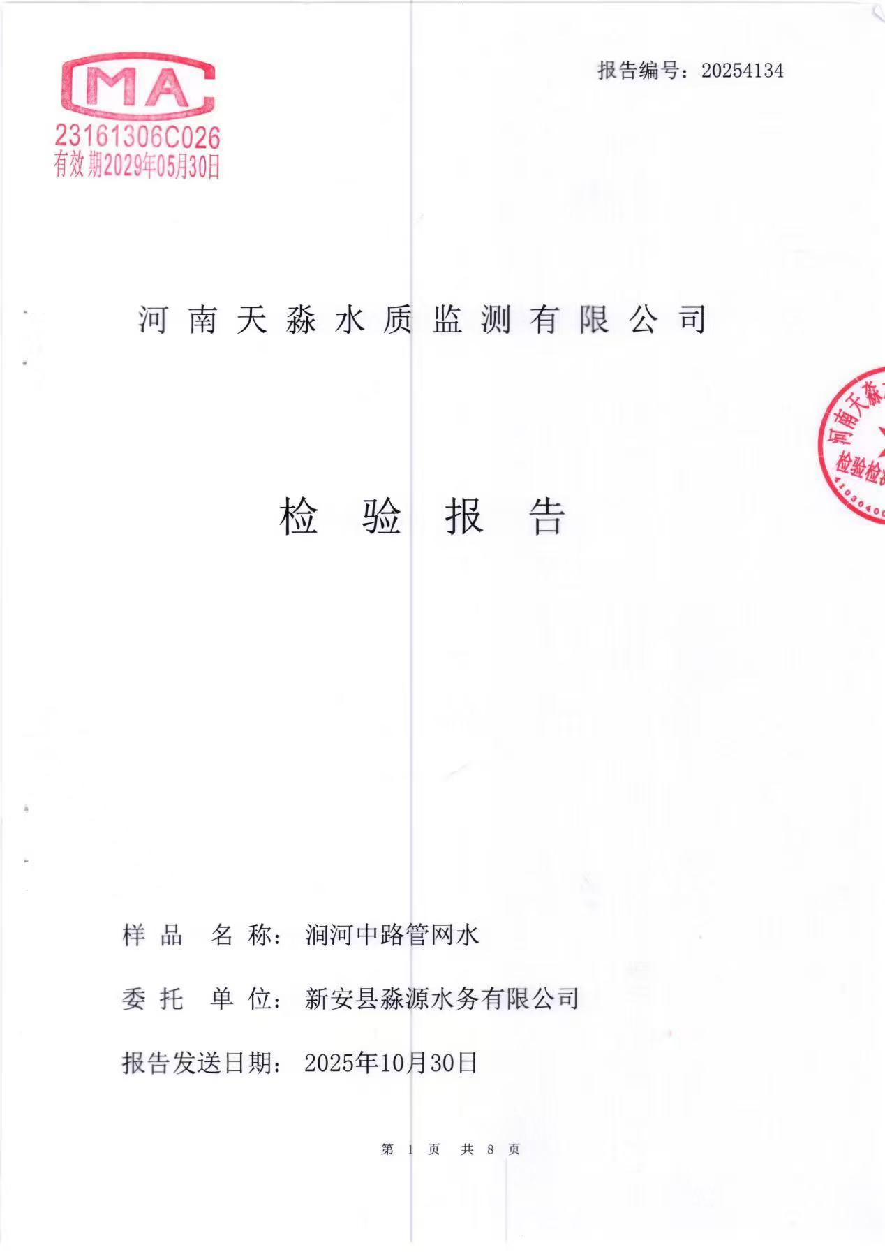 淼源水务10月份末梢水水质检测报告